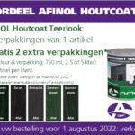 In de maand juli 2022 hebben wij een extra aantrekkelijke actie voor de inkoop van Houtcoat Teerlook in kleinverpakking. Bestel 10 verpakkingen van dezelfde kleur en u ontvangt er 2 gratis. Dit geldt voor verpakkingen van 750 ml, 2,5 liter en 5 liter. Bel of mail uw bestelling. Bestelt u via de shop, dan voegen […] Lees verder »